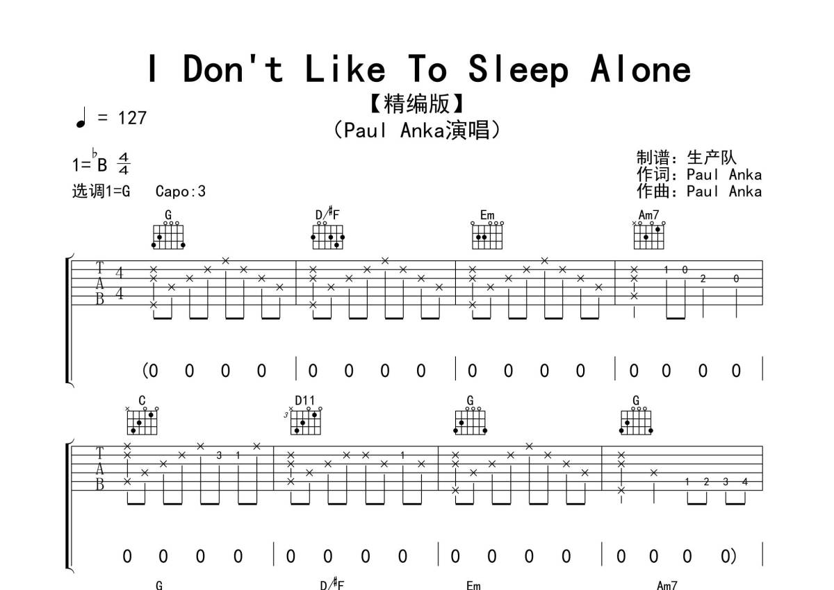 《I Don't Like To Sleep Alone》是Paul Anka演唱的一首歌曲,拍号为4/4拍,歌曲速度为每分钟127拍,歌曲原调为Bb调,但由于原调指法比较难,为了方便弹奏,本吉他谱采用的是G调指法编配,变调夹3品弹奏即为原调,当然也可以根据自己的音域改变变调夹位置,或者通过改变和弦调性,以方便自己弹奏,这份吉他谱共有四张高清图谱,图谱由 @生产队 编配上传,图谱使用六线谱编配,包含吉他和弦指法、简谱以及歌词部分,使用这份I Don't Like To Sleep Alone吉他谱,可以让你更加方便地掌握这首歌曲的弹唱技巧,快来尝试吧。