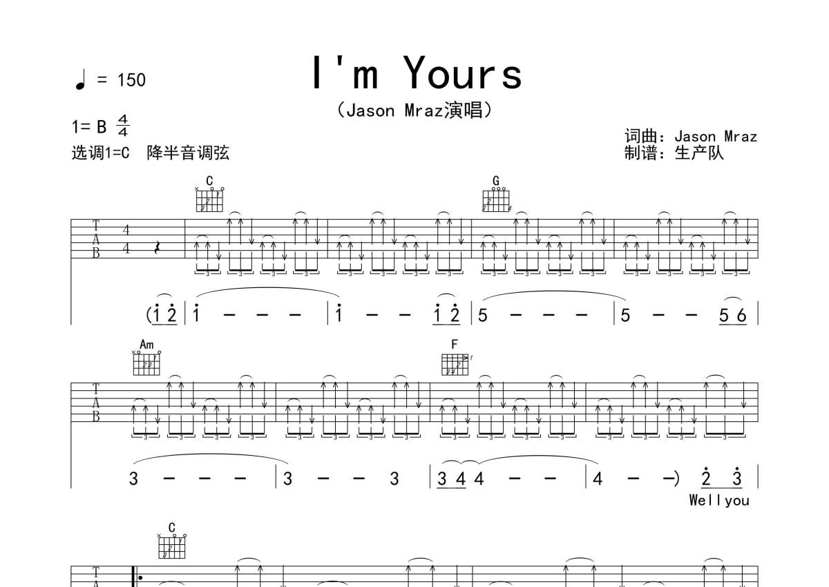 《I'm Yours》是Jason Mraz演唱的一首歌曲,拍号为4/4拍,歌曲速度为每分钟150拍,歌曲原调为B调,但由于原调指法比较难,为了方便弹奏,本吉他谱采用的是C调指法编配,降半音调弦弹奏即为原调,当然也可以根据自己的音域决定是否调弦,这份吉他谱共有五张高清图谱,图谱由 @生产队 编配上传,图谱使用六线谱编配,包含吉他和弦指法、简谱以及歌词部分,使用这份I'm Yours吉他谱,可以让你更加方便地掌握这首歌曲的弹唱技巧,快来尝试吧。