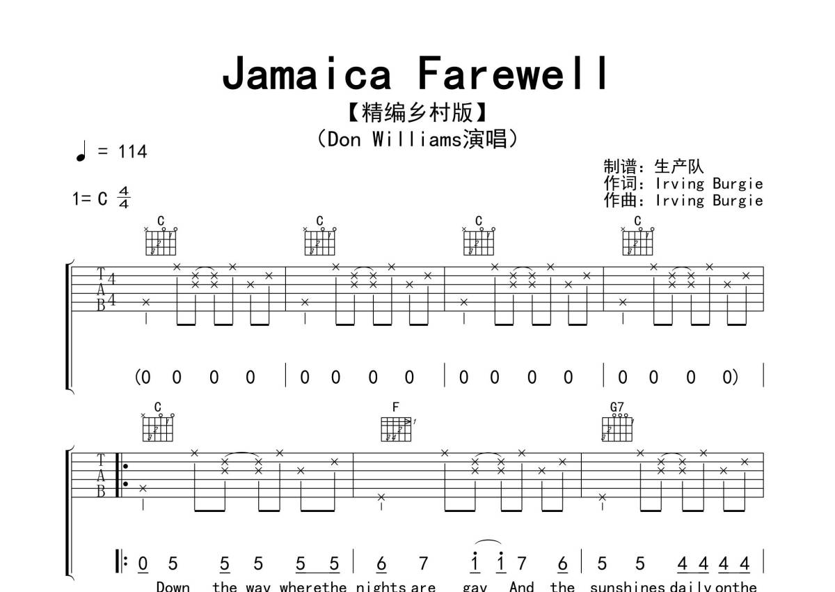 《Jamaica Farewell》是Don Williams演唱的一首歌曲,拍号为4/4拍,歌曲速度为每分钟114拍,歌曲原调为C调,本吉他谱采用的是C调指法编配,演奏时不需要使用变调夹即为原调,这份吉他谱共有三张高清图谱,图谱由 @生产队 编配上传,图谱使用六线谱编配,包含吉他和弦指法、简谱以及歌词部分,使用这份Jamaica Farewell吉他谱,可以让你更加方便地掌握这首歌曲的弹唱技巧,快来尝试吧。