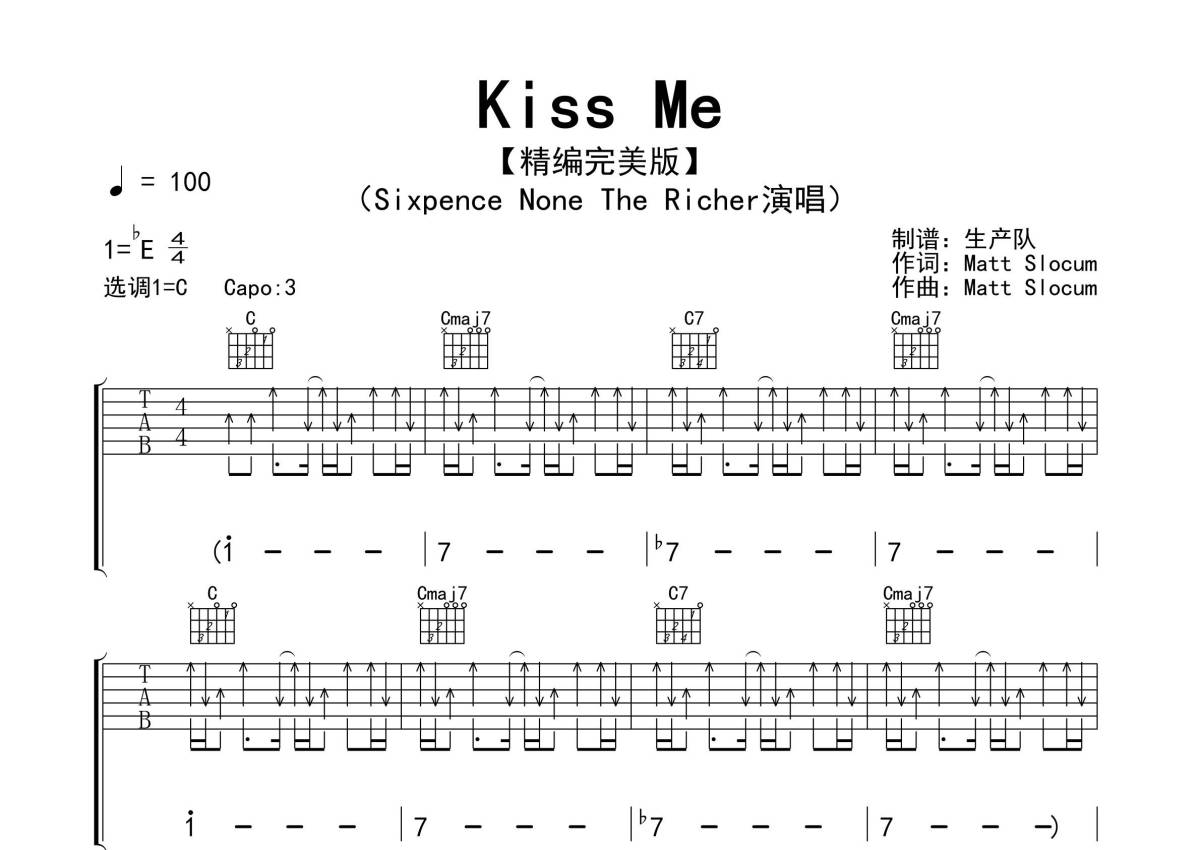 《Kiss Me》是Sixpence None The Richer演唱的一首歌曲,拍号为4/4拍,歌曲速度为每分钟100拍,歌曲原调为Eb调,但由于原调指法比较难,为了方便弹奏,本吉他谱采用的是C调指法编配,变调夹3品弹奏即为原调,当然也可以根据自己的音域改变变调夹位置,或者通过改变和弦调性,以方便自己弹奏,这份吉他谱共有四张高清图谱,图谱由 @生产队 编配上传,图谱使用六线谱编配,包含吉他和弦指法、简谱以及歌词部分,使用这份Kiss Me吉他谱,可以让你更加方便地掌握这首歌曲的弹唱技巧,快来尝试吧。