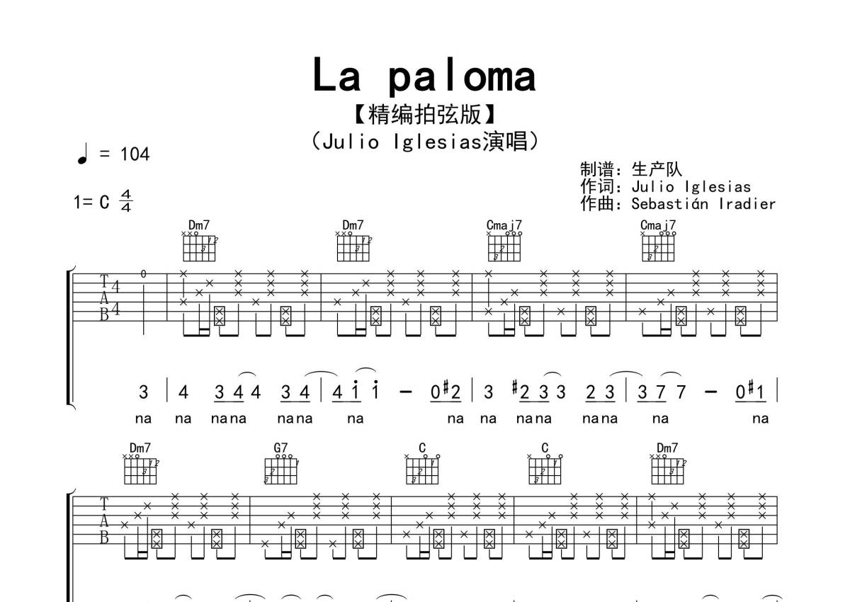 《La paloma》是Julio Iglesias演唱的一首歌曲,拍号为4/4拍,歌曲速度为每分钟104拍,歌曲原调为C调,本吉他谱采用的是C调指法编配,演奏时不需要使用变调夹即为原调,这份吉他谱共有四张高清图谱,图谱由 @生产队 编配上传,图谱使用六线谱编配,包含吉他和弦指法、简谱以及歌词部分,使用这份La paloma吉他谱,可以让你更加方便地掌握这首歌曲的弹唱技巧,快来尝试吧。