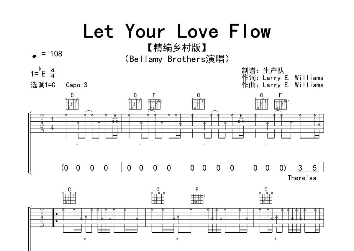 《Let Your Love Flow》是Bellamy Brothers演唱的一首歌曲,拍号为4/4拍,歌曲速度为每分钟108拍,歌曲原调为Eb调,但由于原调指法比较难,为了方便弹奏,本吉他谱采用的是C调指法编配,变调夹3品弹奏即为原调,当然也可以根据自己的音域改变变调夹位置,或者通过改变和弦调性,以方便自己弹奏,这份吉他谱共有四张高清图谱,图谱由 @生产队 编配上传,图谱使用六线谱编配,包含吉他和弦指法、简谱以及歌词部分,使用这份Let Your Love Flow吉他谱,可以让你更加方便地掌握这首歌曲的弹唱技巧,快来尝试吧。