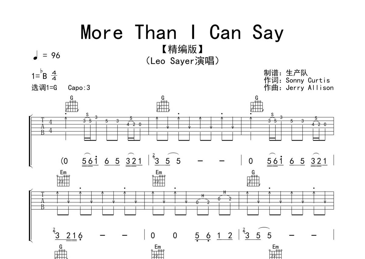《More Than I Can Say》是Leo Sayer演唱的一首歌曲,拍号为4/4拍,歌曲速度为每分钟96拍,歌曲原调为Bb调,但由于原调指法比较难,为了方便弹奏,本吉他谱采用的是G调指法编配,变调夹3品弹奏即为原调,当然也可以根据自己的音域改变变调夹位置,或者通过改变和弦调性,以方便自己弹奏,这份吉他谱共有四张高清图谱,图谱由 @生产队 编配上传,图谱使用六线谱编配,包含吉他和弦指法、简谱以及歌词部分,使用这份More Than I Can Say吉他谱,可以让你更加方便地掌握这首歌曲的弹唱技巧,快来尝试吧。