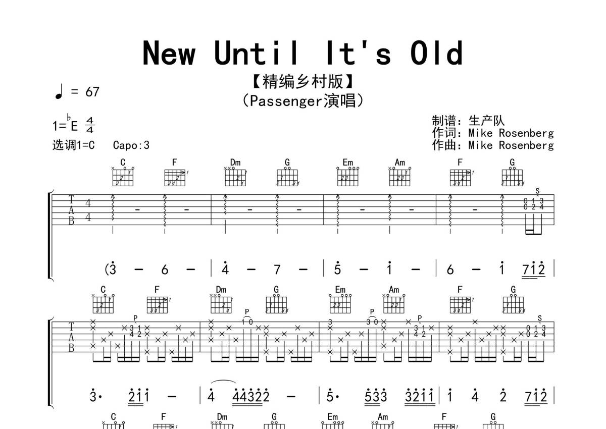 《New Until It's Old》是Passenger演唱的一首歌曲,拍号为4/4拍,歌曲速度为每分钟67拍,歌曲原调为Eb调,但由于原调指法比较难,为了方便弹奏,本吉他谱采用的是C调指法编配,变调夹3品弹奏即为原调,当然也可以根据自己的音域改变变调夹位置,或者通过改变和弦调性,以方便自己弹奏,这份吉他谱共有三张高清图谱,图谱由 @生产队 编配上传,图谱使用六线谱编配,包含吉他和弦指法、简谱以及歌词部分,使用这份New Until It's Old吉他谱,可以让你更加方便地掌握这首歌曲的弹唱技巧,快来尝试吧。