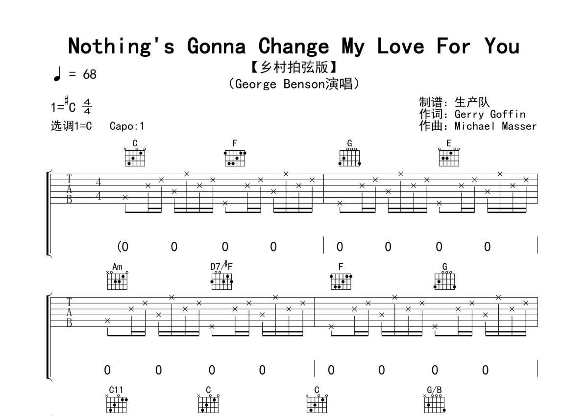 《Nothing's Gonna Change My Love For You》是George Benson演唱的一首歌曲,拍号为4/4拍,歌曲速度为每分钟68拍,歌曲原调为Db调,但由于原调指法比较难,为了方便弹奏,本吉他谱采用的是C调指法编配,变调夹1品弹奏即为原调,当然也可以根据自己的音域改变变调夹位置,或者通过改变和弦调性,以方便自己弹奏,这份吉他谱共有四张高清图谱,图谱由 @生产队 编配上传,图谱使用六线谱编配,包含吉他和弦指法、简谱以及歌词部分,使用这份Nothing's Gonna Change My Love For You吉他谱,可以让你更加方便地掌握这首歌曲的弹唱技巧,快来尝试吧。