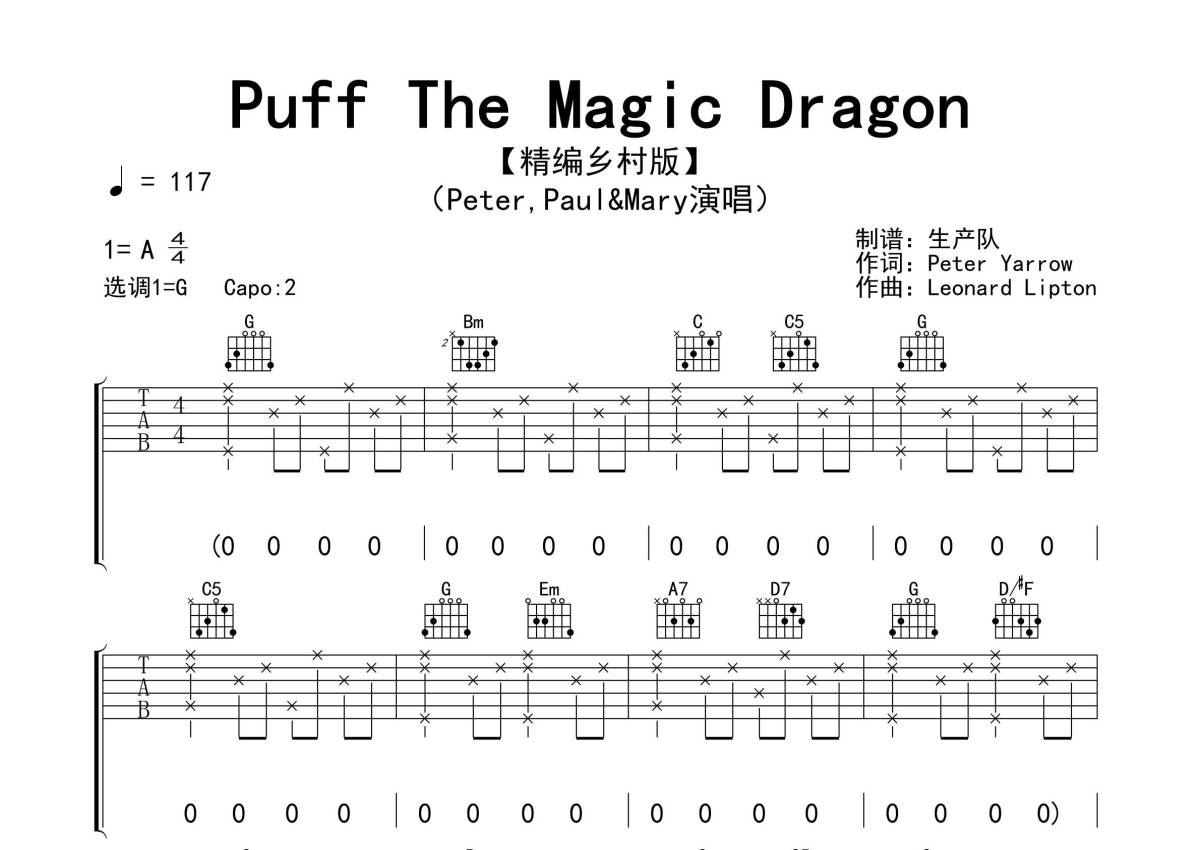 《Puff The Magic Dragon》是Peter Paul &Mary演唱的一首歌曲,拍号为4/4拍,歌曲速度为每分钟117拍,歌曲原调为A调,但由于原调指法比较难,为了方便弹奏,本吉他谱采用的是G调指法编配,变调夹2品弹奏即为原调,当然也可以根据自己的音域改变变调夹位置,或者通过改变和弦调性,以方便自己弹奏,这份吉他谱共有四张高清图谱,图谱由 @生产队 编配上传,图谱使用六线谱编配,包含吉他和弦指法、简谱以及歌词部分,使用这份Puff The Magic Dragon吉他谱,可以让你更加方便地掌握这首歌曲的弹唱技巧,快来尝试吧。
