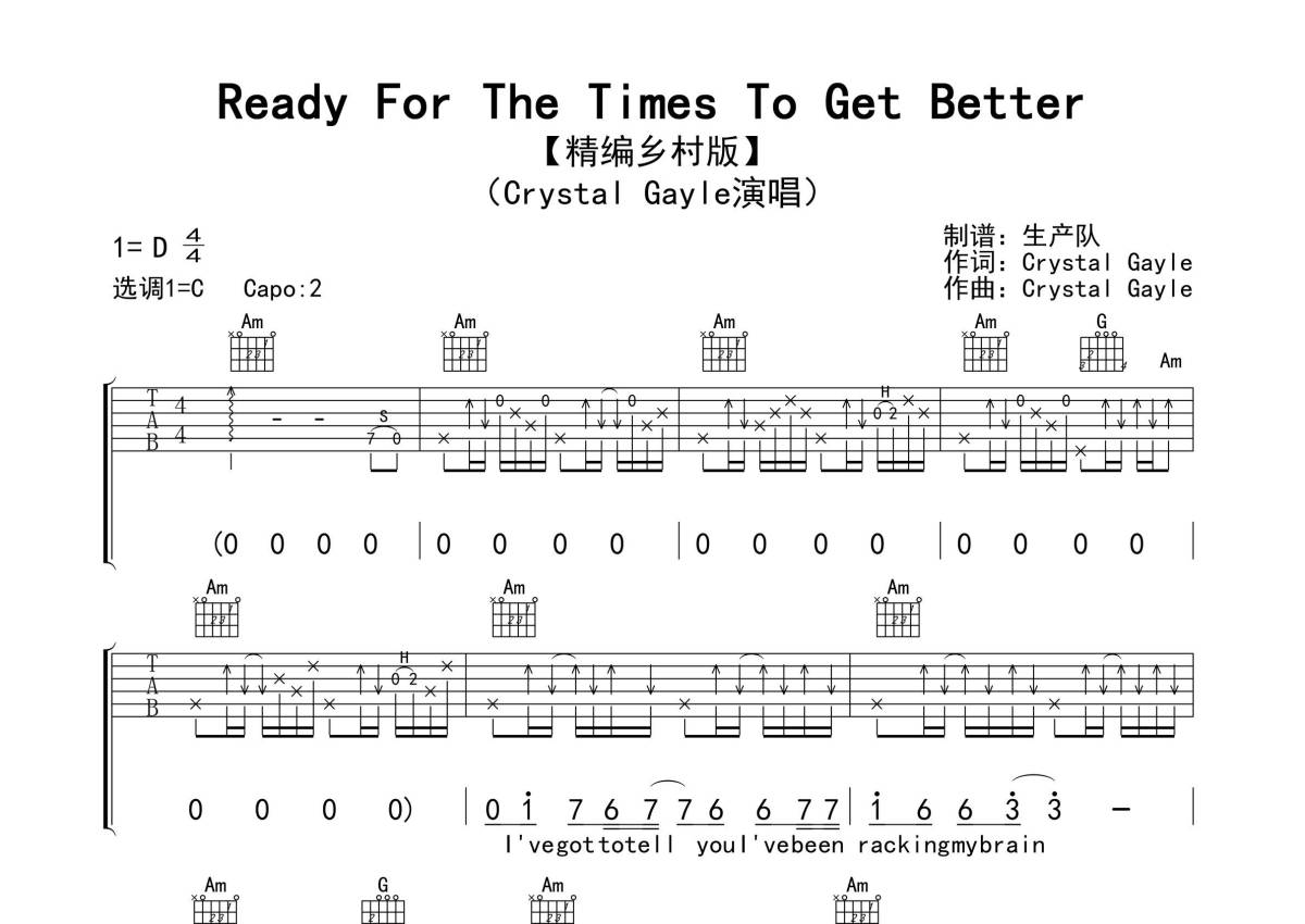 《Ready For The Times To Get Better》是Crystal Gayle演唱的一首歌曲,拍号为4/4拍,歌曲原调为D调,但由于原调指法比较难,为了方便弹奏,本吉他谱采用的是C调指法编配,变调夹2品弹奏即为原调,当然也可以根据自己的音域改变变调夹位置,或者通过改变和弦调性,以方便自己弹奏,这份吉他谱共有三张高清图谱,图谱由 @生产队 编配上传,图谱使用六线谱编配,包含吉他和弦指法、简谱以及歌词部分,使用这份Ready For The Times To Get Better吉他谱,可以让你更加方便地掌握这首歌曲的弹唱技巧,快来尝试吧。