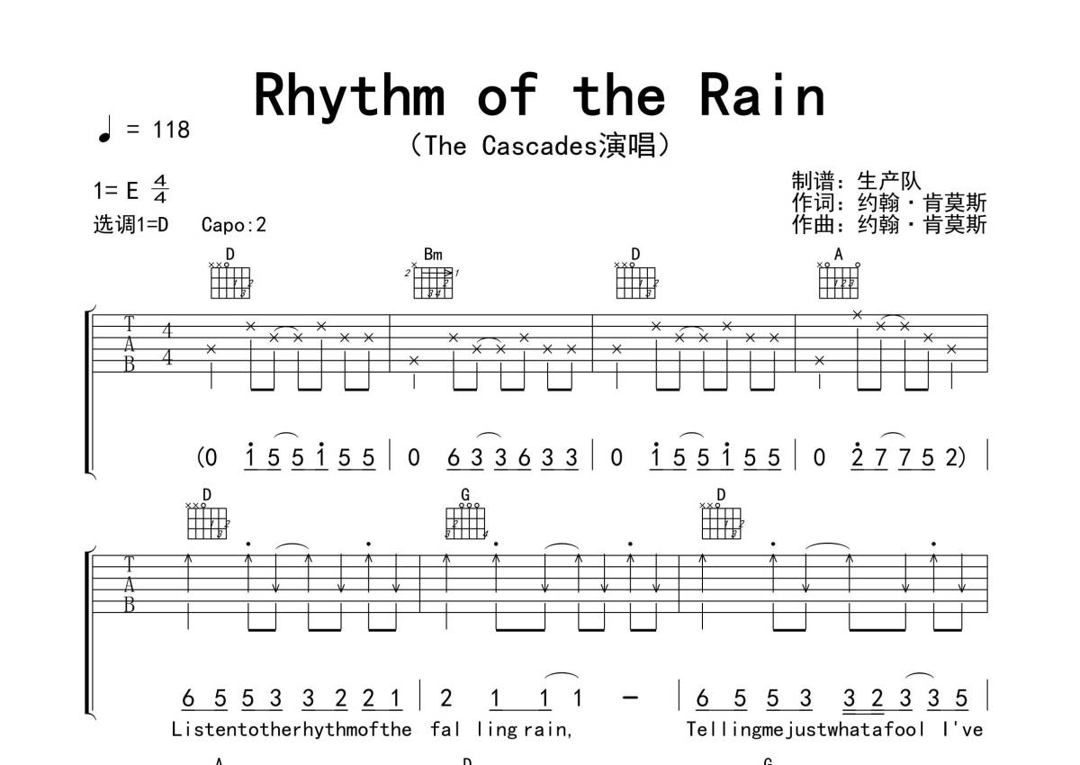 《Rhythm of the Rain》是The Cascades演唱的一首歌曲,拍号为4/4拍,歌曲速度为每分钟118拍,歌曲原调为E调,但由于原调指法比较难,为了方便弹奏,本吉他谱采用的是E调指法编配,变调夹2品弹奏即为原调,当然也可以根据自己的音域改变变调夹位置,或者通过改变和弦调性,以方便自己弹奏,这份吉他谱共有四张高清图谱,图谱由 @生产队 编配上传,图谱使用六线谱编配,包含吉他和弦指法、简谱以及歌词部分,使用这份Rhythm of the Rain吉他谱,可以让你更加方便地掌握这首歌曲的弹唱技巧,快来尝试吧。