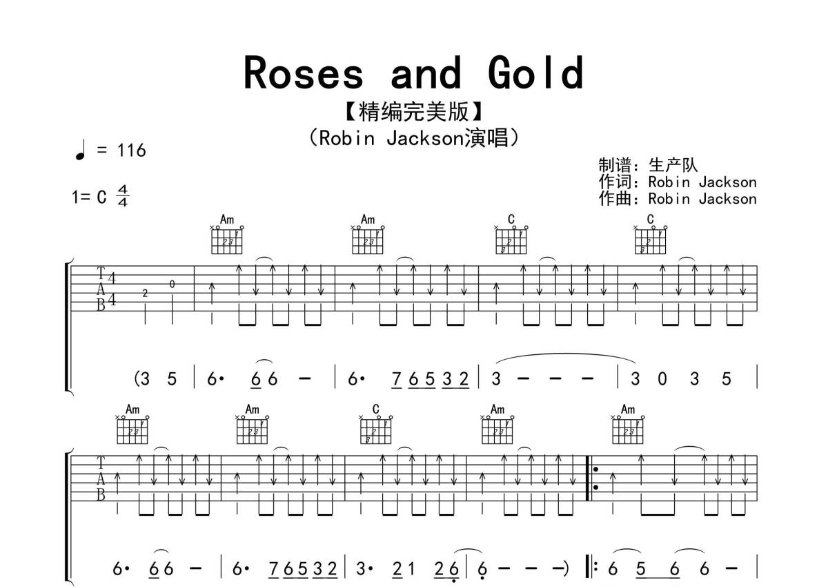 《Roses and Gold》是Robin Jackson演唱的一首歌曲,拍号为4/4拍,歌曲速度为每分钟116拍,歌曲原调为C调,本吉他谱采用的是C调指法编配,演奏时不需要使用变调夹即为原调,这份吉他谱共有三张高清图谱,图谱由 @生产队 编配上传,图谱使用六线谱编配,包含吉他和弦指法、简谱以及歌词部分,使用这份Roses and Gold吉他谱,可以让你更加方便地掌握这首歌曲的弹唱技巧,快来尝试吧。《Roses and Gold》是美国独立的乡村、爵士创作歌手Robin Jackson创作并演唱的歌曲,于2012年6月1日公开发行。本吉他谱根据原版C调指法编配,采用原版的扫弦节奏编配,本曲段落较多,每一个段落的旋律有个别差异,请听原唱演奏弹唱,值得推荐学习的欧美金曲!。