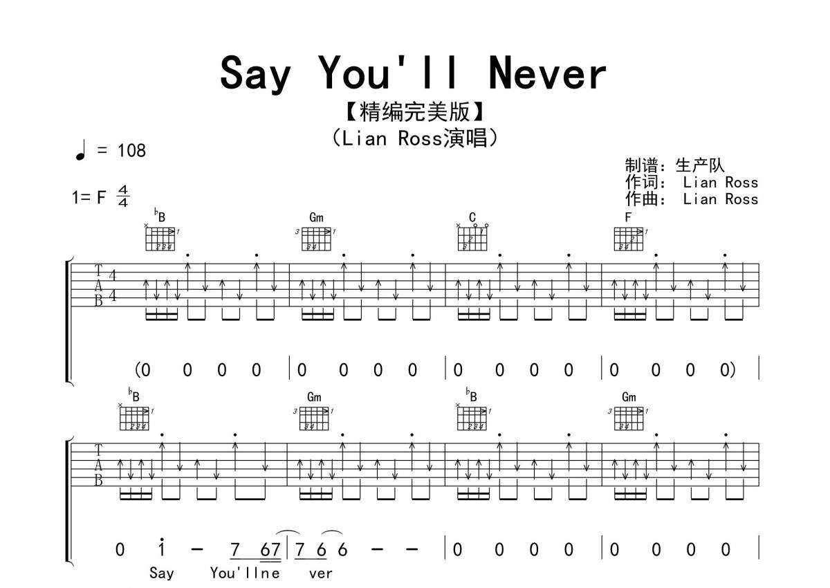 Lian Ross《Say You'll Never》吉他谱 - F调弹唱六线谱