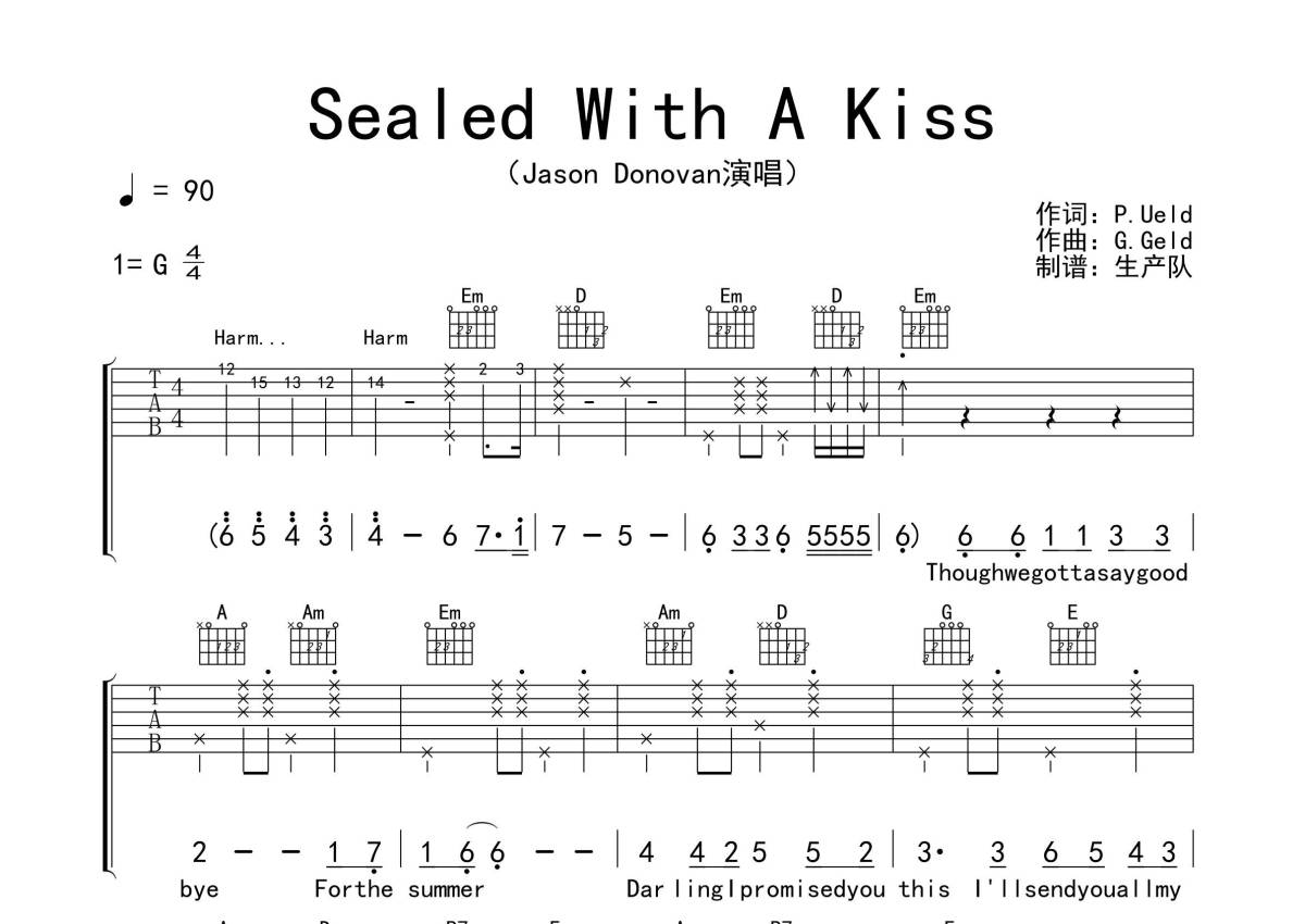 《Sealed With A Kiss》是Jason Donovan演唱的一首歌曲,拍号为4/4拍,歌曲速度为每分钟90拍,歌曲原调为G调,本吉他谱采用的是G调指法编配,演奏时不需要使用变调夹即为原调,这份吉他谱共有三张高清图谱,图谱由 @生产队 编配上传,图谱使用六线谱编配,包含吉他和弦指法、简谱以及歌词部分,使用这份Sealed With A Kiss吉他谱,可以让你更加方便地掌握这首歌曲的弹唱技巧,快来尝试吧。代表一个时代的的经典歌曲,本吉他谱根据原版编配,转调部分有点难,需要刻苦练习,准确完整的前奏,间奏,尾奏编配,一音不差版,致敬经典作品!!。