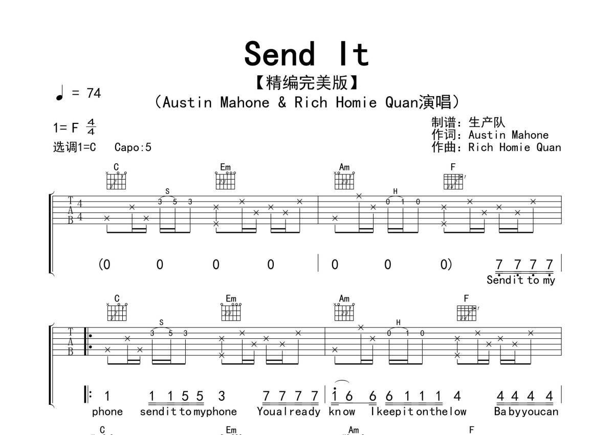 《Send It》是Austin Mahone/Rich Homie Quan演唱的一首歌曲,拍号为4/4拍,歌曲速度为每分钟74拍,歌曲原调为F调,但由于原调指法比较难,为了方便弹奏,本吉他谱采用的是C调指法编配,变调夹5品弹奏即为原调,当然也可以根据自己的音域改变变调夹位置,或者通过改变和弦调性,以方便自己弹奏,这份吉他谱共有四张高清图谱,图谱由 @生产队 编配上传,图谱使用六线谱编配,包含吉他和弦指法、简谱以及歌词部分,使用这份Send It吉他谱,可以让你更加方便地掌握这首歌曲的弹唱技巧,快来尝试吧。本曲的和声很有特点,简约而不简单,值得推荐学习的欧美金曲!。