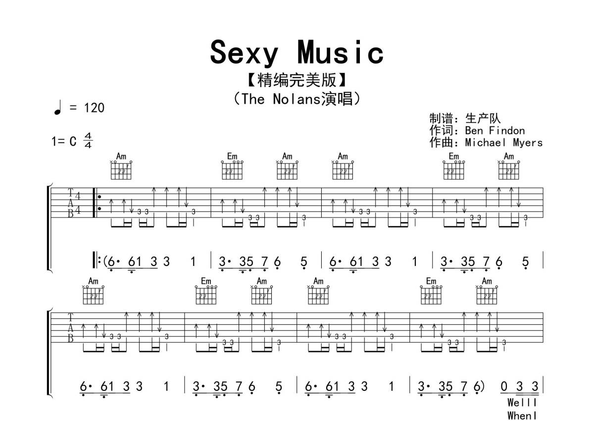 《Sexy Music》是The Molans演唱的一首歌曲,拍号为4/4拍,歌曲速度为每分钟120拍,歌曲原调为C调,本吉他谱采用的是C调指法编配,演奏时不需要使用变调夹即为原调,这份吉他谱共有三张高清图谱,图谱由 @生产队 编配上传,图谱使用六线谱编配,包含吉他和弦指法、简谱以及歌词部分,使用这份Sexy Music吉他谱,可以让你更加方便地掌握这首歌曲的弹唱技巧,快来尝试吧。