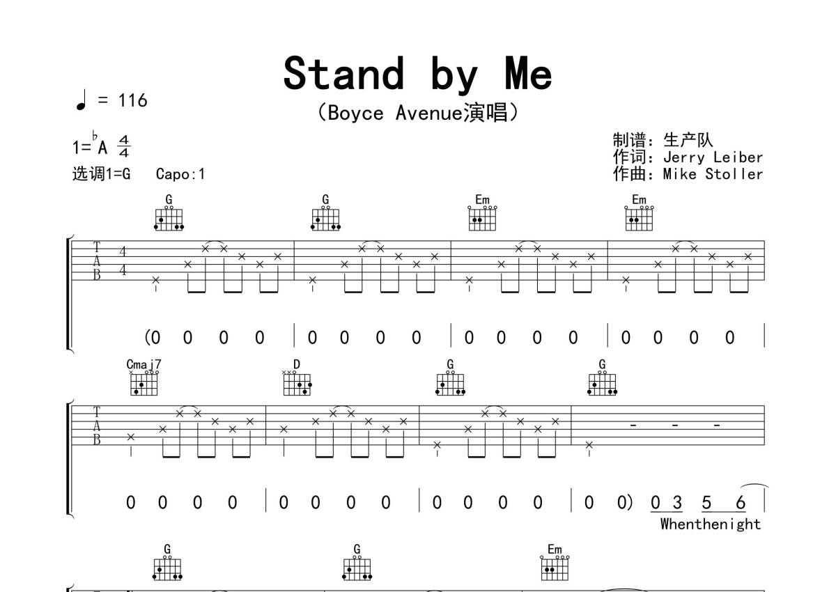 《Stand by Me》是Boyce Avenue演唱的一首歌曲,拍号为4/4拍,歌曲速度为每分钟116拍,歌曲原调为Ab调,但由于原调指法比较难,为了方便弹奏,本吉他谱采用的是G调指法编配,变调夹1品弹奏即为原调,当然也可以根据自己的音域改变变调夹位置,或者通过改变和弦调性,以方便自己弹奏,这份吉他谱共有三张高清图谱,图谱由 @生产队 编配上传,图谱使用六线谱编配,包含吉他和弦指法、简谱以及歌词部分,使用这份Stand by Me吉他谱,可以让你更加方便地掌握这首歌曲的弹唱技巧,快来尝试吧。