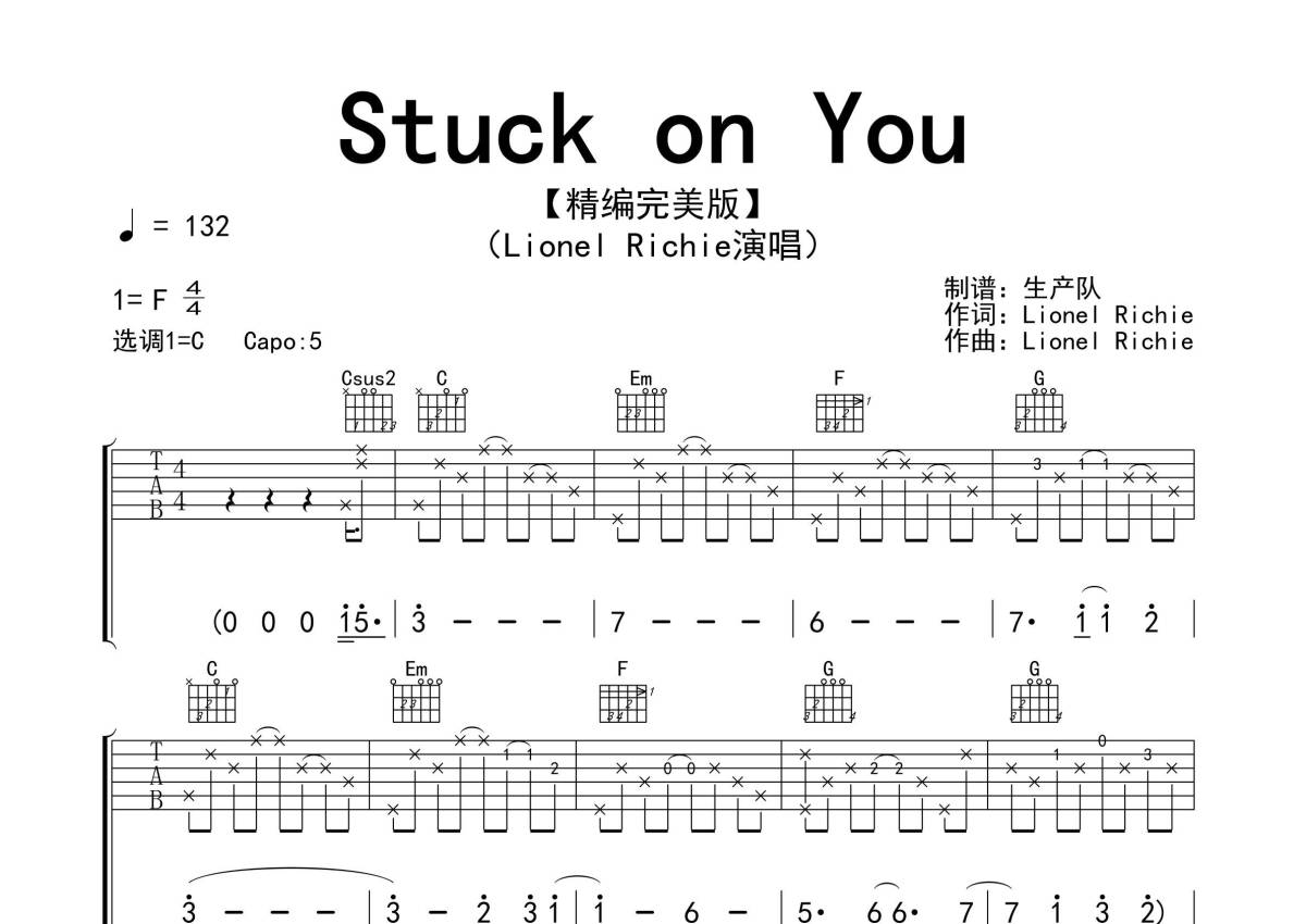 《Stuck on You》是Lionel Richie演唱的一首歌曲,拍号为4/4拍,歌曲速度为每分钟132拍,歌曲原调为F调,但由于原调指法比较难,为了方便弹奏,本吉他谱采用的是C调指法编配,变调夹5品弹奏即为原调,当然也可以根据自己的音域改变变调夹位置,或者通过改变和弦调性,以方便自己弹奏,这份吉他谱共有四张高清图谱,图谱由 @生产队 编配上传,图谱使用六线谱编配,包含吉他和弦指法、简谱以及歌词部分,使用这份Stuck on You吉他谱,可以让你更加方便地掌握这首歌曲的弹唱技巧,快来尝试吧。精准的前奏、间奏、尾奏和SOLO编配,值得推荐学习的欧美金曲!。