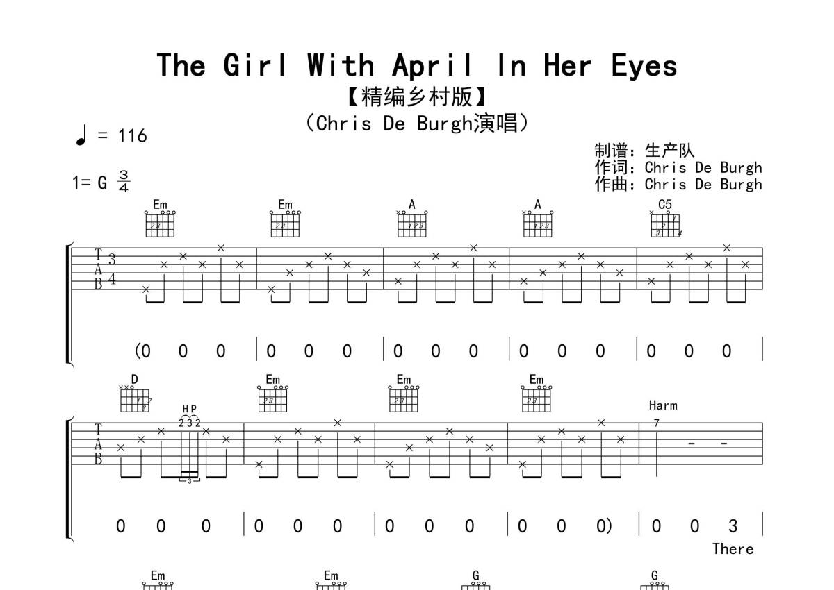 《The Girl With April In Her Eyes》是Chris de Burgh演唱的一首歌曲,拍号为3/4拍,歌曲速度为每分钟116拍,歌曲原调为G调,本吉他谱采用的是G调指法编配,演奏时不需要使用变调夹即为原调,这份吉他谱共有四张高清图谱,图谱由 @生产队 编配上传,图谱使用六线谱编配,包含吉他和弦指法、简谱以及歌词部分,使用这份The Girl With April In Her Eyes吉他谱,可以让你更加方便地掌握这首歌曲的弹唱技巧,快来尝试吧。注意:本曲存在两种拍号3/4和4/4自由切换,非常有特色,为了更加适合吉他弹唱,本吉他谱对原版和弦和节奏进行了部分优化处理。值得推荐学习的欧美金曲!。