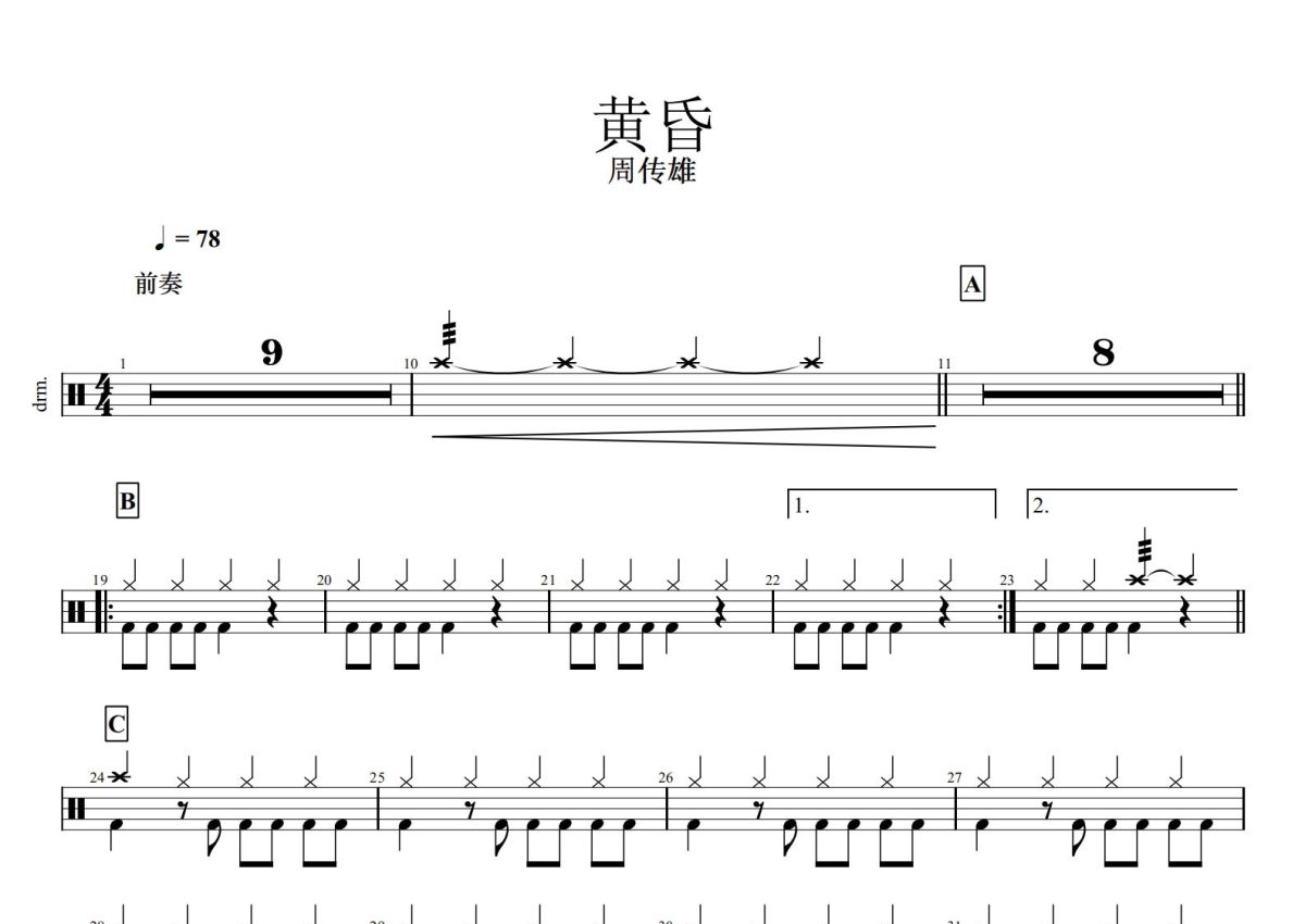 周传雄《黄昏》鼓谱 - 架子鼓谱