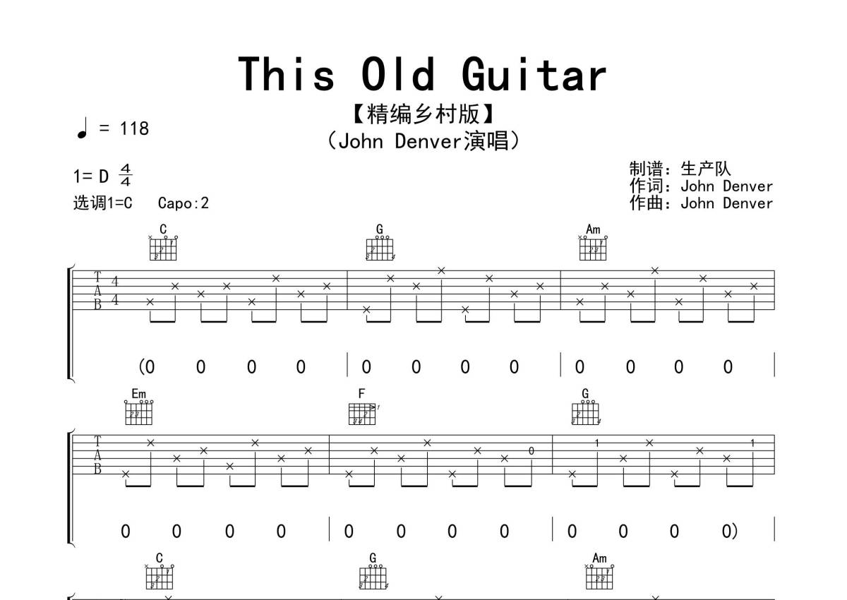 《This Old Guitar》是John Denver演唱的一首歌曲,拍号为4/4拍,歌曲速度为每分钟118拍,歌曲原调为D调,但由于原调指法比较难,为了方便弹奏,本吉他谱采用的是C调指法编配,变调夹2品弹奏即为原调,当然也可以根据自己的音域改变变调夹位置,或者通过改变和弦调性,以方便自己弹奏,这份吉他谱共有四张高清图谱,图谱由 @生产队 编配上传,图谱使用六线谱编配,包含吉他和弦指法、简谱以及歌词部分,使用这份This Old Guitar吉他谱,可以让你更加方便地掌握这首歌曲的弹唱技巧,快来尝试吧。