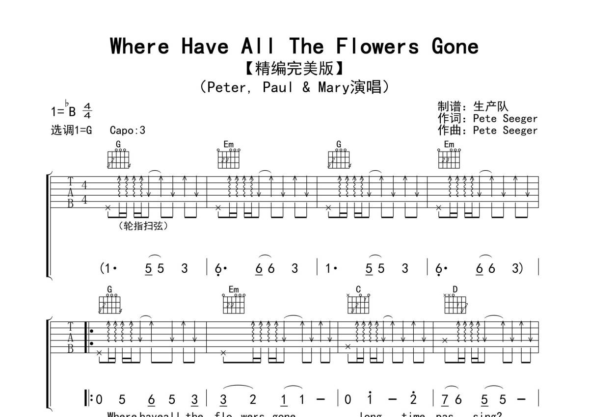 《Where Have All The Flowers Gone》是Peter.Paul/Mary演唱的一首歌曲,拍号为4/4拍,歌曲原调为Bb调,但由于原调指法比较难,为了方便弹奏,本吉他谱采用的是G调指法编配,变调夹3品弹奏即为原调,当然也可以根据自己的音域改变变调夹位置,或者通过改变和弦调性,以方便自己弹奏,这份吉他谱共有三张高清图谱,图谱由 @生产队 编配上传,图谱使用六线谱编配,包含吉他和弦指法、简谱以及歌词部分,使用这份Where Have All The Flowers Gone吉他谱,可以让你更加方便地掌握这首歌曲的弹唱技巧,快来尝试吧。