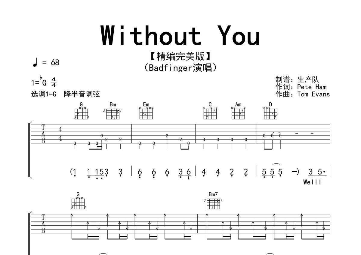 《Without You》是Badfinger演唱的一首歌曲,精编完美版,拍号为4/4拍,歌曲速度为每分钟68拍,歌曲原调为Gb调,但由于原调指法比较难,为了方便弹奏,本吉他谱采用的是G调指法编配,降半音调弦弹奏即为原调,当然也可以根据自己的音域决定是否调弦,这份吉他谱共有四张高清图谱,图谱由 @生产队 编配上传,图谱使用六线谱编配,包含吉他和弦指法、简谱以及歌词部分,使用这份Without You吉他谱,可以让你更加方便地掌握这首歌曲的弹唱技巧,快来尝试吧。