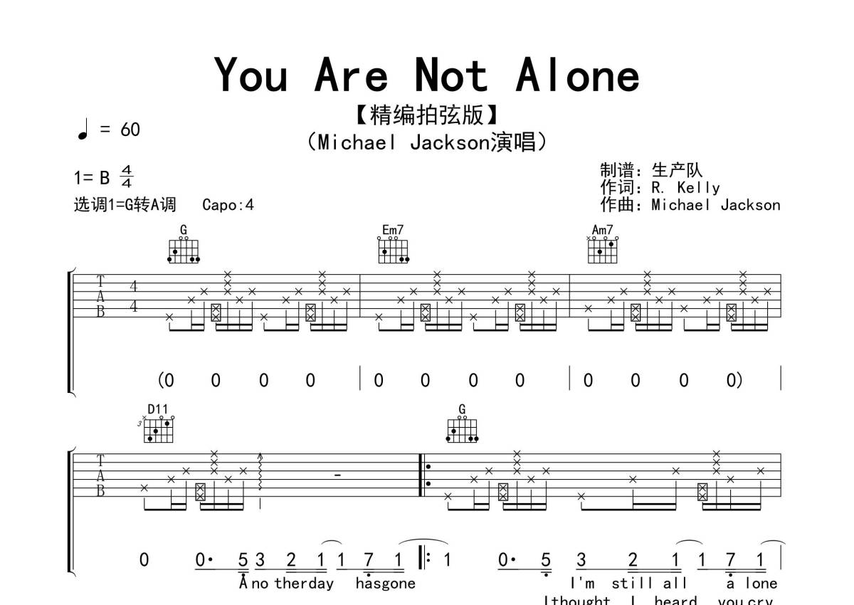 《You Are Not Alone》是Michael Jackson演唱的一首歌曲,精编拍弦版,拍号为4/4拍,歌曲速度为每分钟60拍,歌曲原调为B调,但由于原调指法比较难,为了方便弹奏,本吉他谱采用的是B调指法编配,变调夹4品弹奏即为原调,当然也可以根据自己的音域改变变调夹位置,或者通过改变和弦调性,以方便自己弹奏,这份吉他谱共有四张高清图谱,图谱由 @生产队 编配上传,图谱使用六线谱编配,包含吉他和弦指法、简谱以及歌词部分,使用这份You Are Not Alone吉他谱,可以让你更加方便地掌握这首歌曲的弹唱技巧,快来尝试吧。