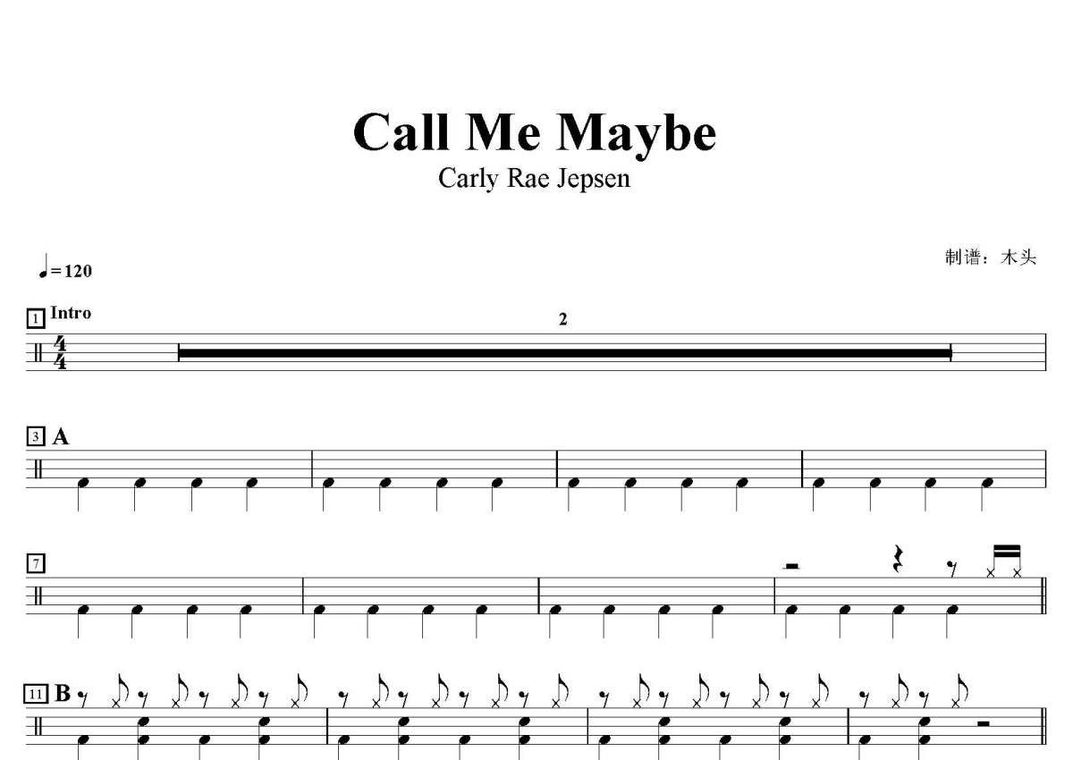 《Call Me Maybe》是Carly Rae Jepsen演唱的一首歌曲,这份鼓谱共有三张高清图谱,图谱由 @打鼓谱 编配上传,图谱使用五线谱编配,使用这份Call Me Maybe架子鼓谱,你将能够轻松地敲打出这首Carly Rae Jepsen的Call Me Maybe,快来尝试吧。歌曲名:Call Me Maybe,歌手名:Carly Rae Jepsen,专辑名:Call Me Maybe。
