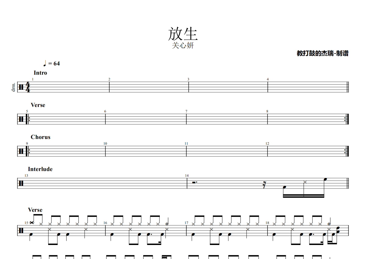 关心妍《放生》鼓谱 - 架子鼓谱