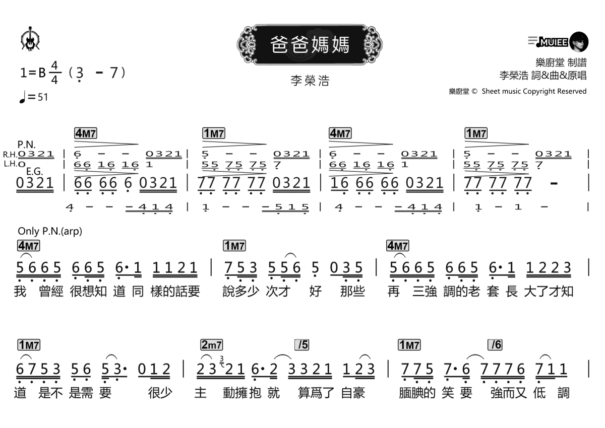 《爸爸妈妈》是李荣浩演唱的一首歌曲,拍号为4/4拍,歌曲速度为每分钟51拍,这份乐队总谱共有两张高清图谱,图谱由 @乐厨堂 编配上传。