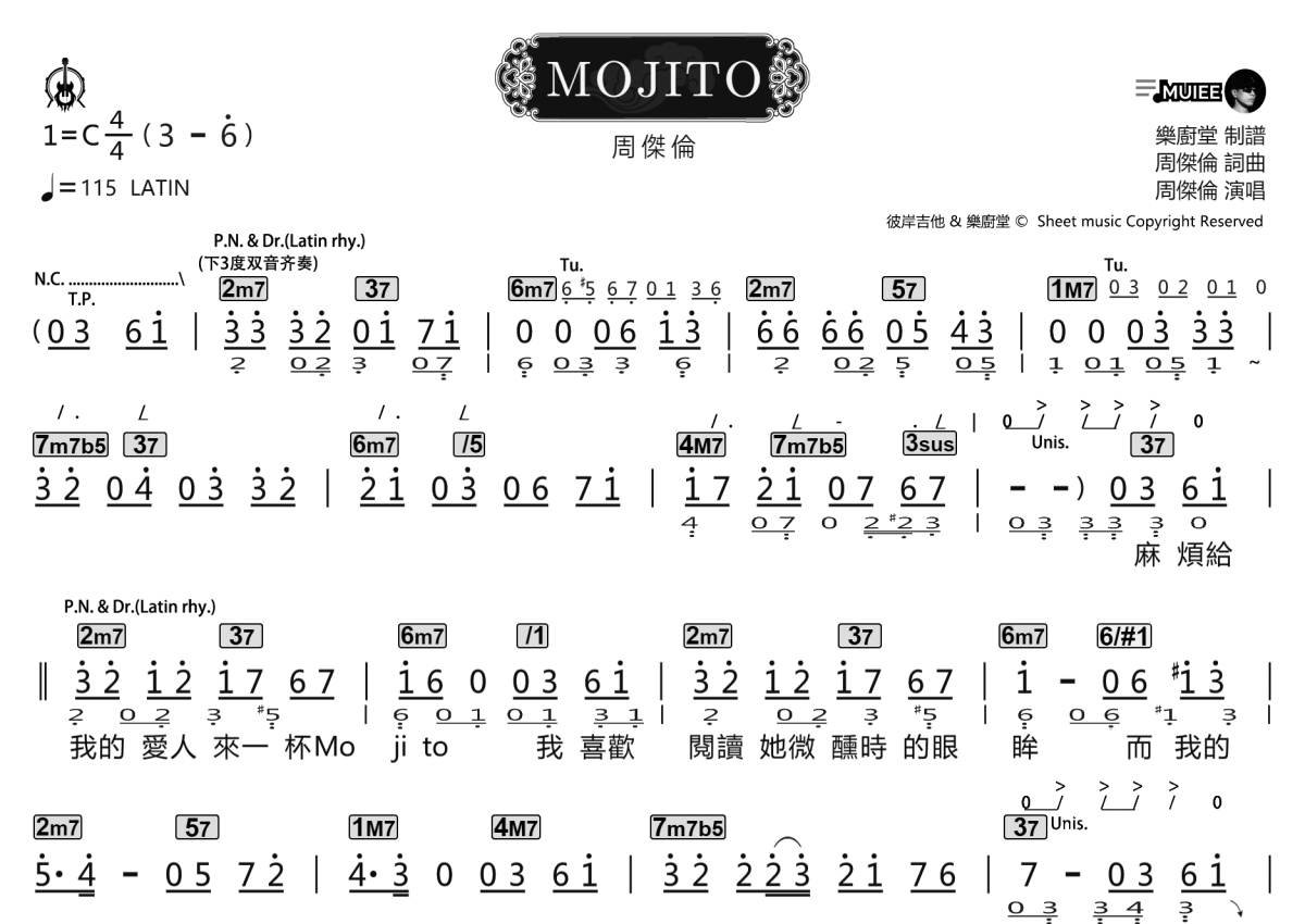 《MOJITO》是周杰伦演唱的一首歌曲,拍号为4/4拍,歌曲速度为每分钟115拍,这份乐队总谱共有三张高清图谱,图谱由 @乐厨堂 编配上传。