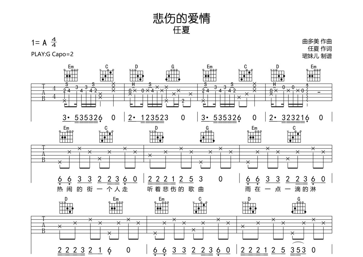 任夏《悲伤的爱情》吉他谱 - G调弹唱六线谱