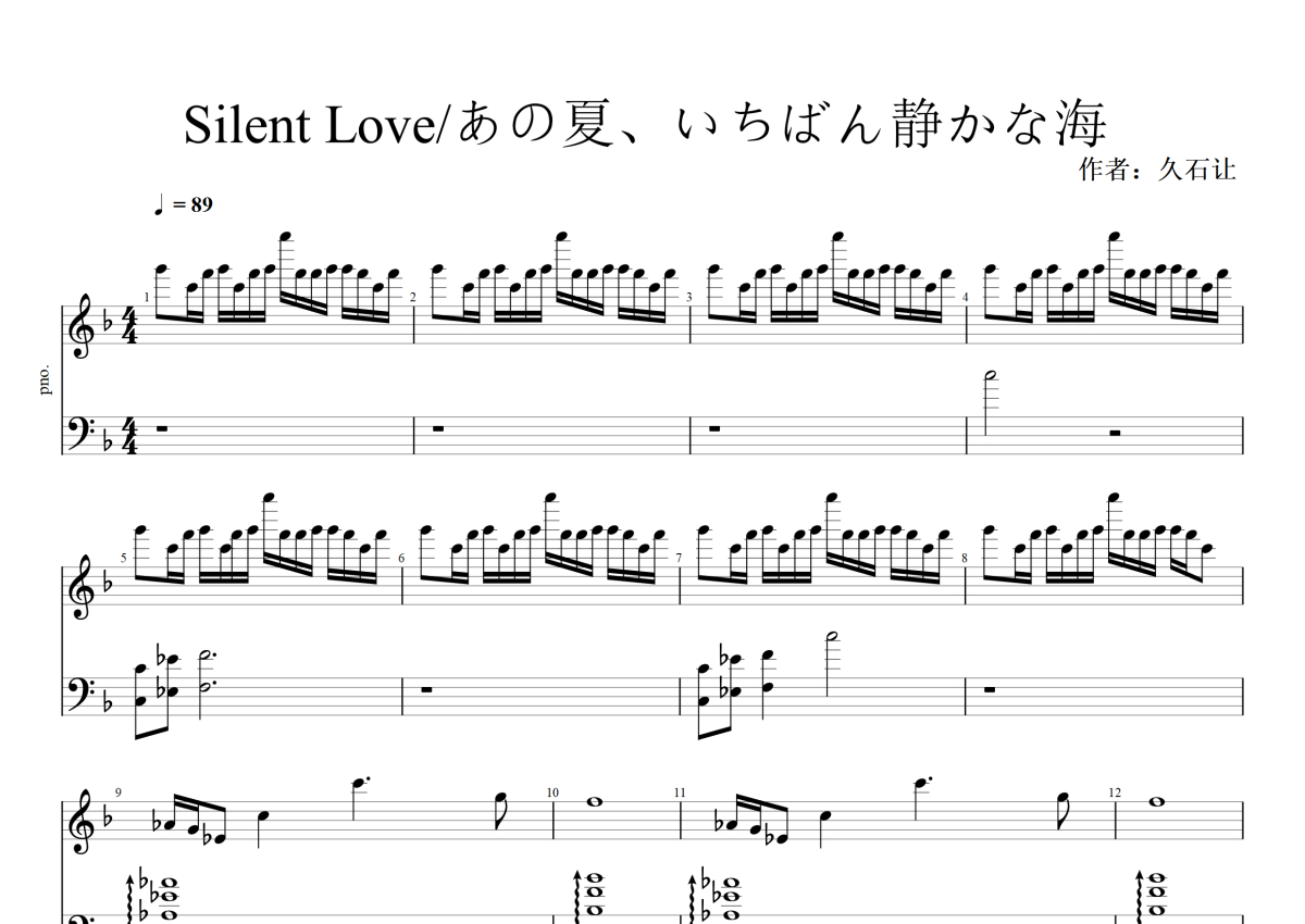 《Silent Love【あの夏、いちばん静かな海】》是久石让演唱的一首歌曲,拍号为4/4拍,歌曲速度为每分钟89拍,这份钢琴谱共有五张高清图谱,图谱由 @Golder 编配上传,曲谱配备了相关的音频提供试听,使用这份Silent Love【あの夏、いちばん静かな海】钢琴谱,可以让你更加方便地掌握这首歌曲的演奏技巧,快来尝试吧。