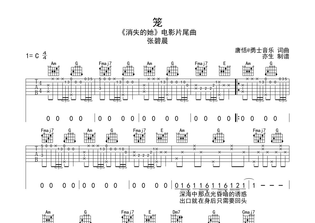 张碧晨《笼》吉他谱 - C调弹唱六线谱
