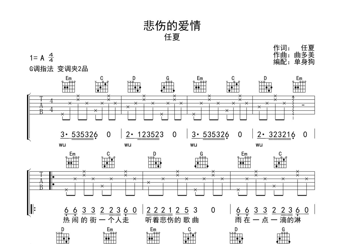 任夏《悲伤的爱情》吉他谱 - G调弹唱六线谱