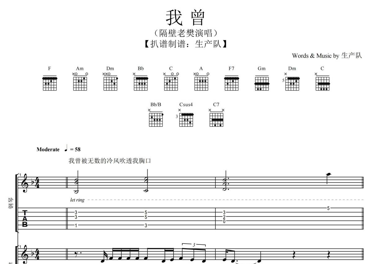 《我曾》是隔壁老樊演唱的一首歌曲,拍号为4/4拍,歌曲速度为每分钟58拍,这份乐队总谱共有一张高清图谱,图谱由 @生产队 编配上传根据原版精准编配,包含:钢琴,吉他,贝斯,键盘,架子鼓,主旋律共7轨,共47页,完整版请下载PDF ,总谱效果请听试听文件。