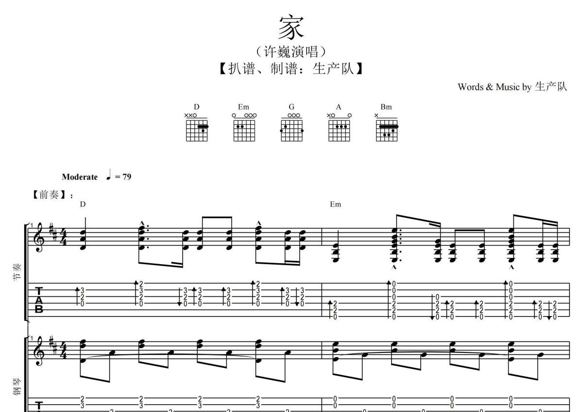 《家》是许巍演唱的一首歌曲,拍号为4/4拍,歌曲速度为每分钟79拍,这份乐队总谱共有一张高清图谱,图谱由 @生产队 编配上传根据原版D调指法编配,总谱包含:吉他(主音),吉他(节奏),贝斯,鼓,钢琴,主旋律总共7轨,完整版共39页,购买后请下载PDF,乐队总谱效果请听试听文件。