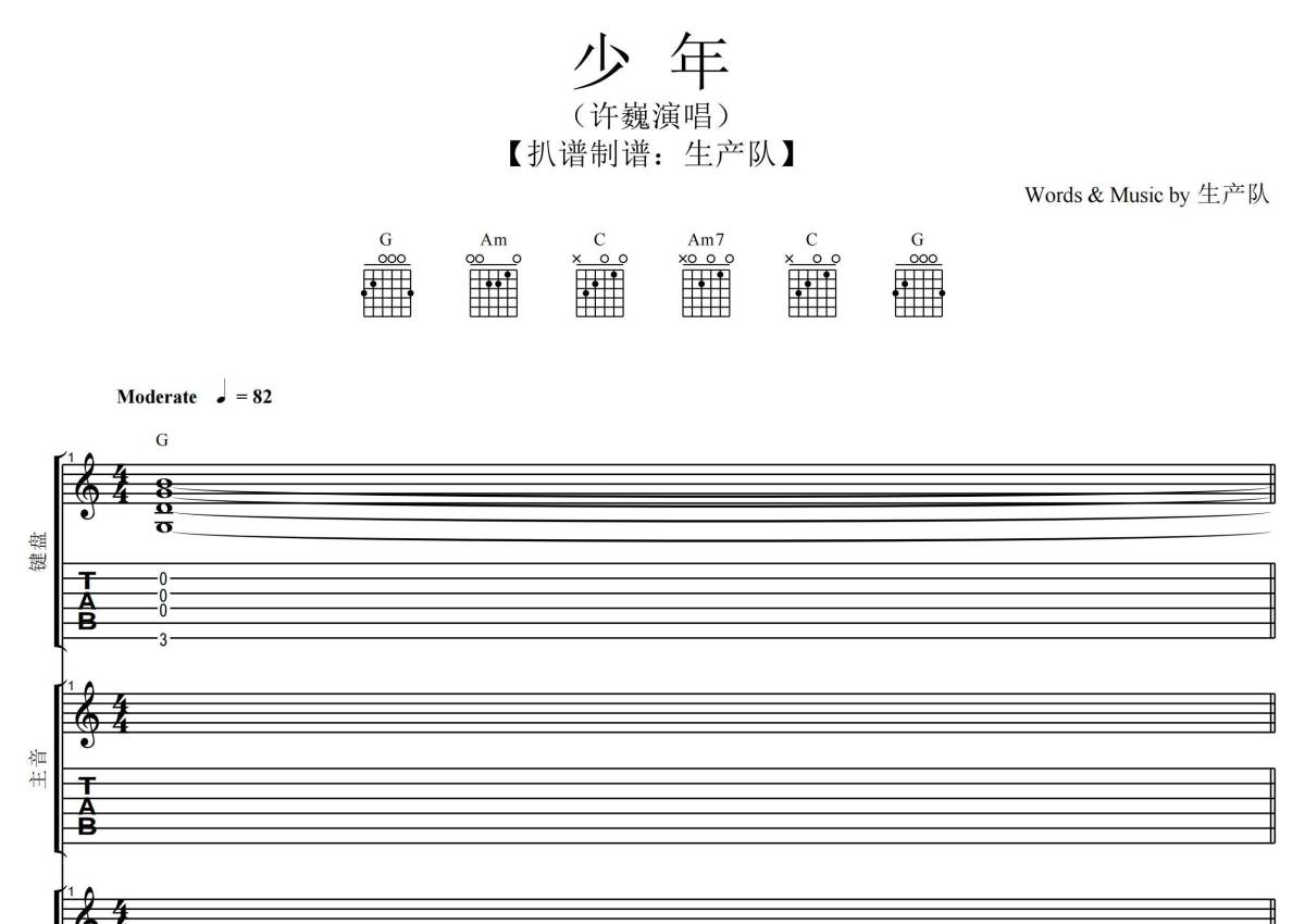 《少年》是许巍演唱的一首歌曲,拍号为4/4拍,歌曲速度为每分钟82拍,这份乐队总谱共有一张高清图谱,图谱由 @生产队 编配上传许巍-《少年》乐队总谱,根据原版G调指法编配,总谱包含:吉他(主音),吉他(节奏),贝斯,鼓,钢琴,主旋律总共7轨,完整版共33页,购买后请下载PDF,乐队总谱效果请听试听文件。