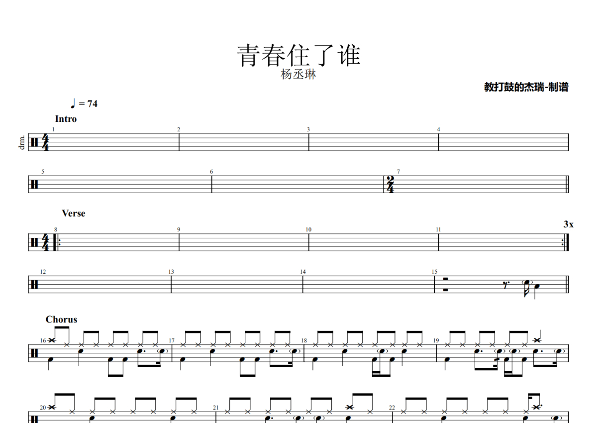 《青春住了谁》是杨丞琳演唱的一首歌曲,拍号为4/4拍,歌曲速度为每分钟74拍,这份鼓谱共有三张高清图谱,图谱由 @Jerry 编配上传,图谱使用五线谱编配,使用这份青春住了谁架子鼓谱,你将能够轻松地敲打出这首杨丞琳的青春住了谁,快来尝试吧。
