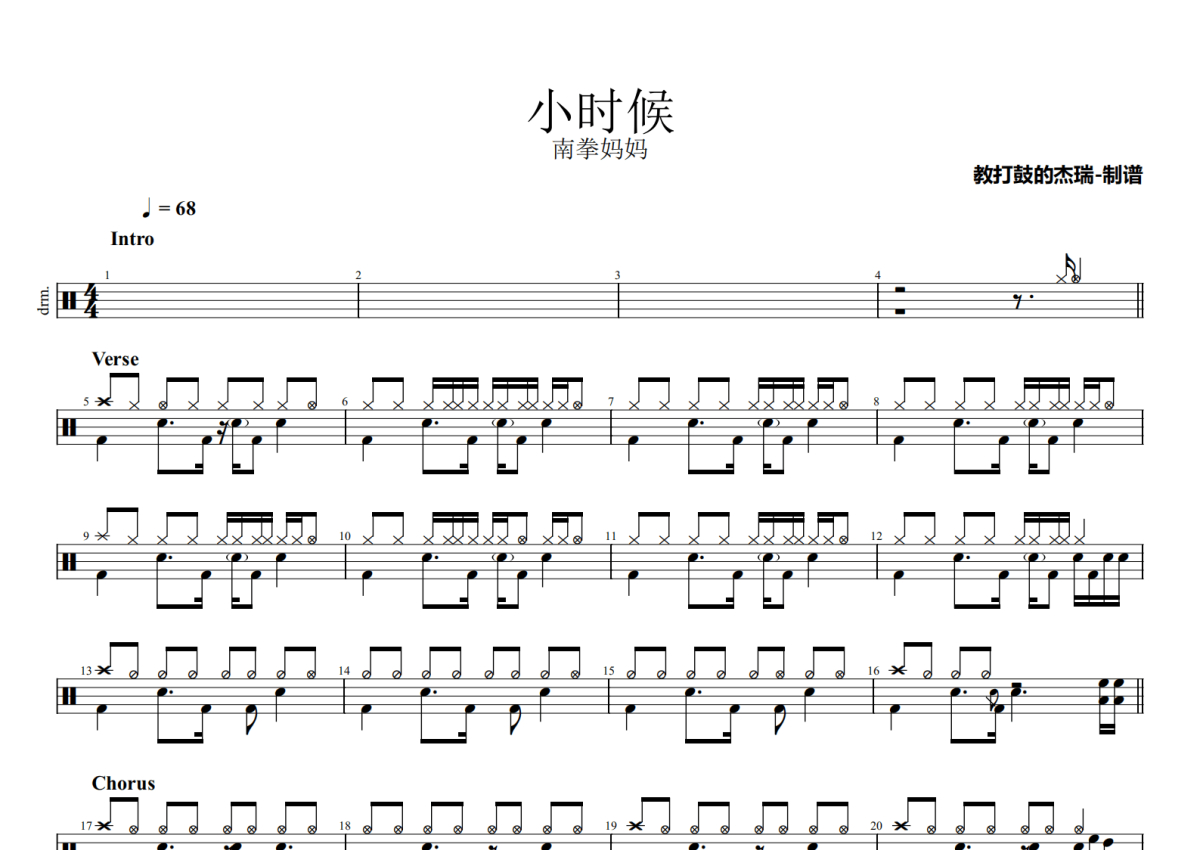 《小时候》是南拳妈妈演唱的一首歌曲,拍号为4/4拍,歌曲速度为每分钟68拍,这份鼓谱共有两张高清图谱,图谱由 @Jerry 编配上传,图谱使用五线谱编配,使用这份小时候架子鼓谱,你将能够轻松地敲打出这首南拳妈妈的小时候,快来尝试吧。