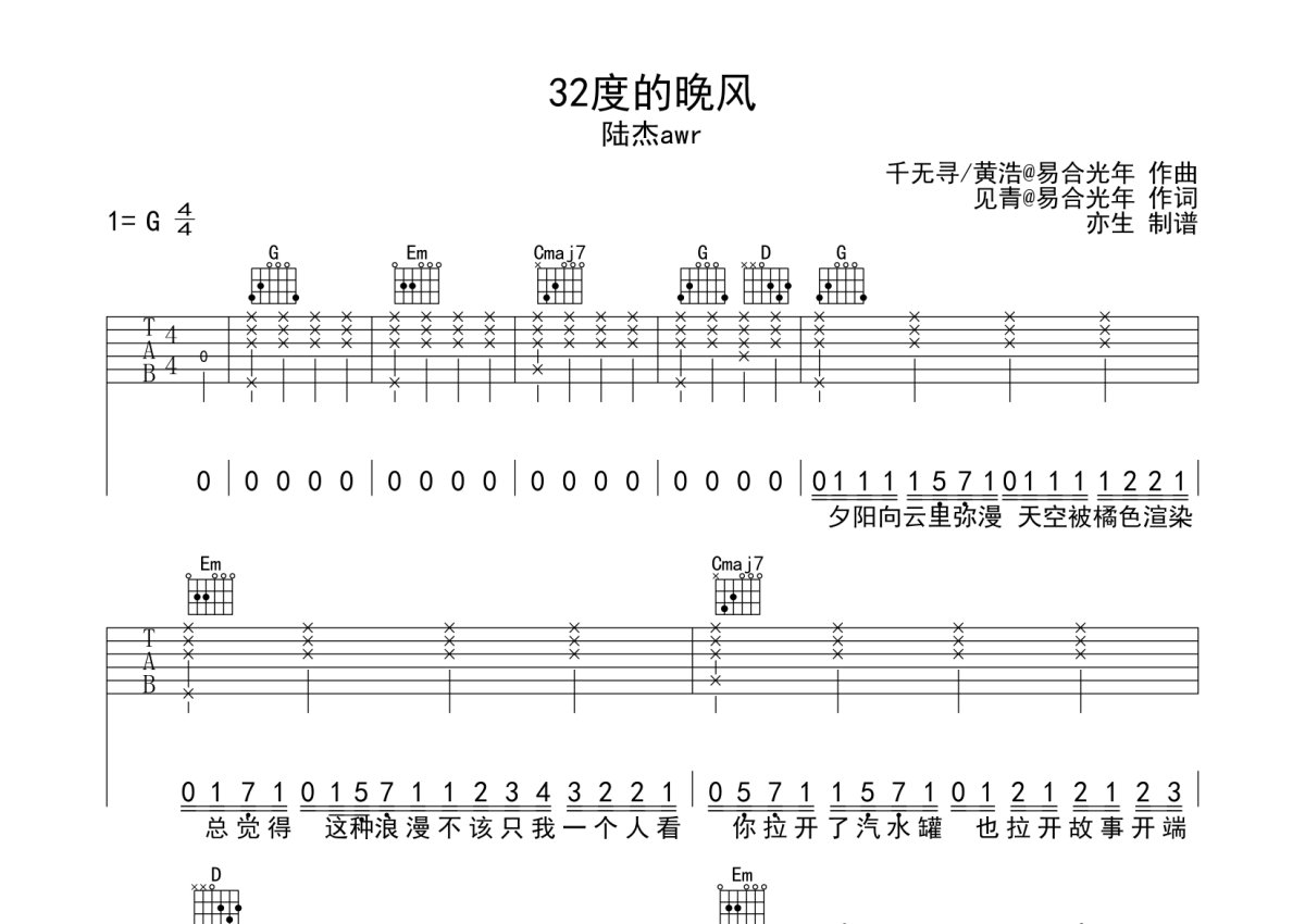 陆杰awr《32度的晚风》吉他谱 - G调弹唱六线谱