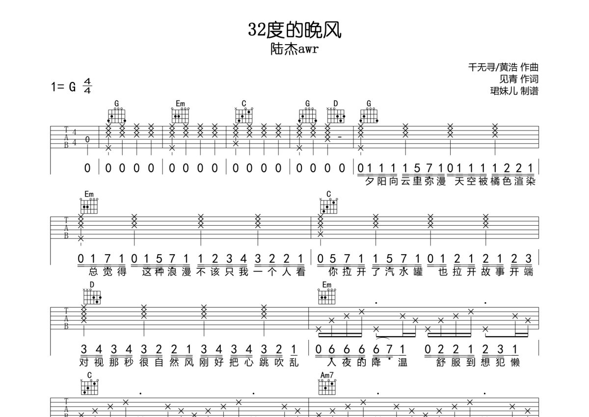 陆杰awr《32度的晚风》吉他谱 - G调弹唱六线谱