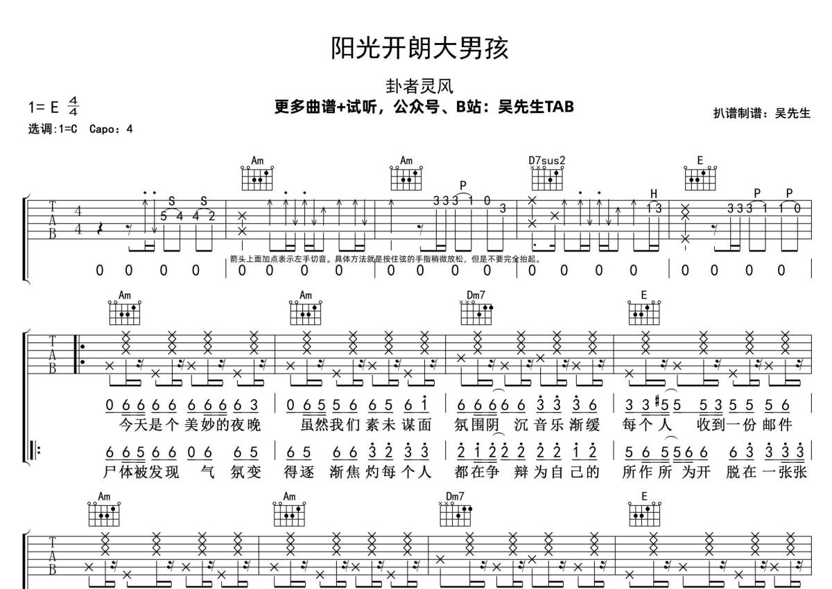 《阳光开朗大男孩》是卦者灵风演唱的一首歌曲,拍号为4/4拍,歌曲速度为每分钟110拍,歌曲原调为E调,但由于原调指法比较难,为了方便弹奏,本吉他谱采用的是C调指法编配,变调夹4品弹奏即为原调,当然也可以根据自己的音域改变变调夹位置,或者通过改变和弦调性,以方便自己弹奏,这份吉他谱共有三张高清图谱,图谱由 @吴先生TAB 编配上传,图谱使用六线谱编配,包含吉他和弦指法、简谱以及歌词部分,曲谱配备了相关的音频提供试听,使用这份阳光开朗大男孩吉他谱,可以让你更加方便地掌握这首歌曲的弹唱技巧,快来尝试吧。