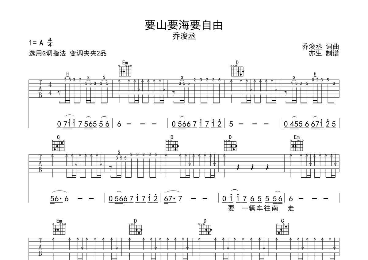《要山要海要自由》是乔浚丞演唱的一首歌曲,拍号为4/4拍,歌曲速度为每分钟65拍,歌曲原调为A调,但由于原调指法比较难,为了方便弹奏,本吉他谱采用的是G调指法编配,变调夹2品弹奏即为原调,当然也可以根据自己的音域改变变调夹位置,或者通过改变和弦调性,以方便自己弹奏,这份吉他谱共有两张高清图谱,图谱由 @亦生 编配上传,图谱使用六线谱编配,包含吉他和弦指法、简谱以及歌词部分,使用这份要山要海要自由吉他谱,可以让你更加方便地掌握这首歌曲的弹唱技巧,快来尝试吧。难度简单。