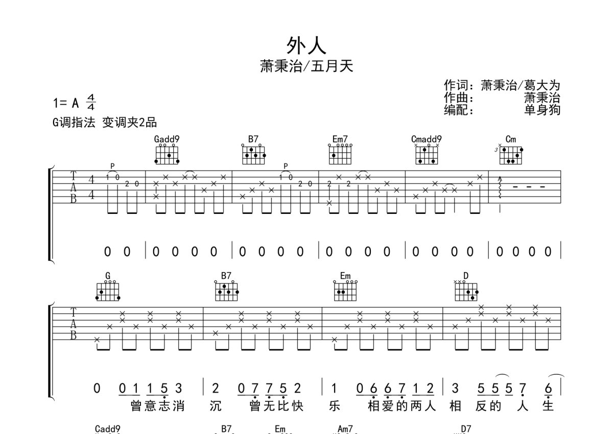 《外人》是萧秉治/五月天演唱的一首歌曲,拍号为4/4拍,歌曲原调为A调,但由于原调指法比较难,为了方便弹奏,本吉他谱采用的是G调指法编配,变调夹2品弹奏即为原调,当然也可以根据自己的音域改变变调夹位置,或者通过改变和弦调性,以方便自己弹奏,这份吉他谱共有四张高清图谱,图谱由 @单身狗 编配上传,图谱使用六线谱编配,包含吉他和弦指法、简谱以及歌词部分,使用这份外人吉他谱,可以让你更加方便地掌握这首歌曲的弹唱技巧,快来尝试吧。