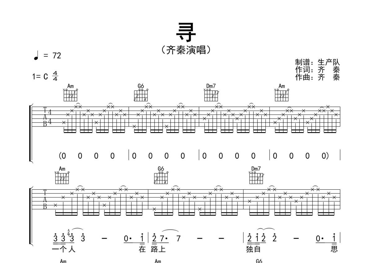 《寻》是齐秦演唱的一首歌曲,精编完美版,拍号为4/4拍,歌曲速度为每分钟72拍,歌曲原调为C调,本吉他谱采用的是C调指法编配,演奏时不需要使用变调夹即为原调,这份吉他谱共有三张高清图谱,图谱由 @生产队 编配上传,图谱使用六线谱编配,包含吉他和弦指法、简谱以及歌词部分,使用这份寻吉他谱,可以让你更加方便地掌握这首歌曲的弹唱技巧,快来尝试吧。《寻》由齐秦演唱并作词作曲的一首歌曲,收录于1986年6月1日的专辑《狼I》中。本吉他谱根据原版采用C调指法编配,主歌分解节奏,副歌扫弦节奏编配,怀旧经典。