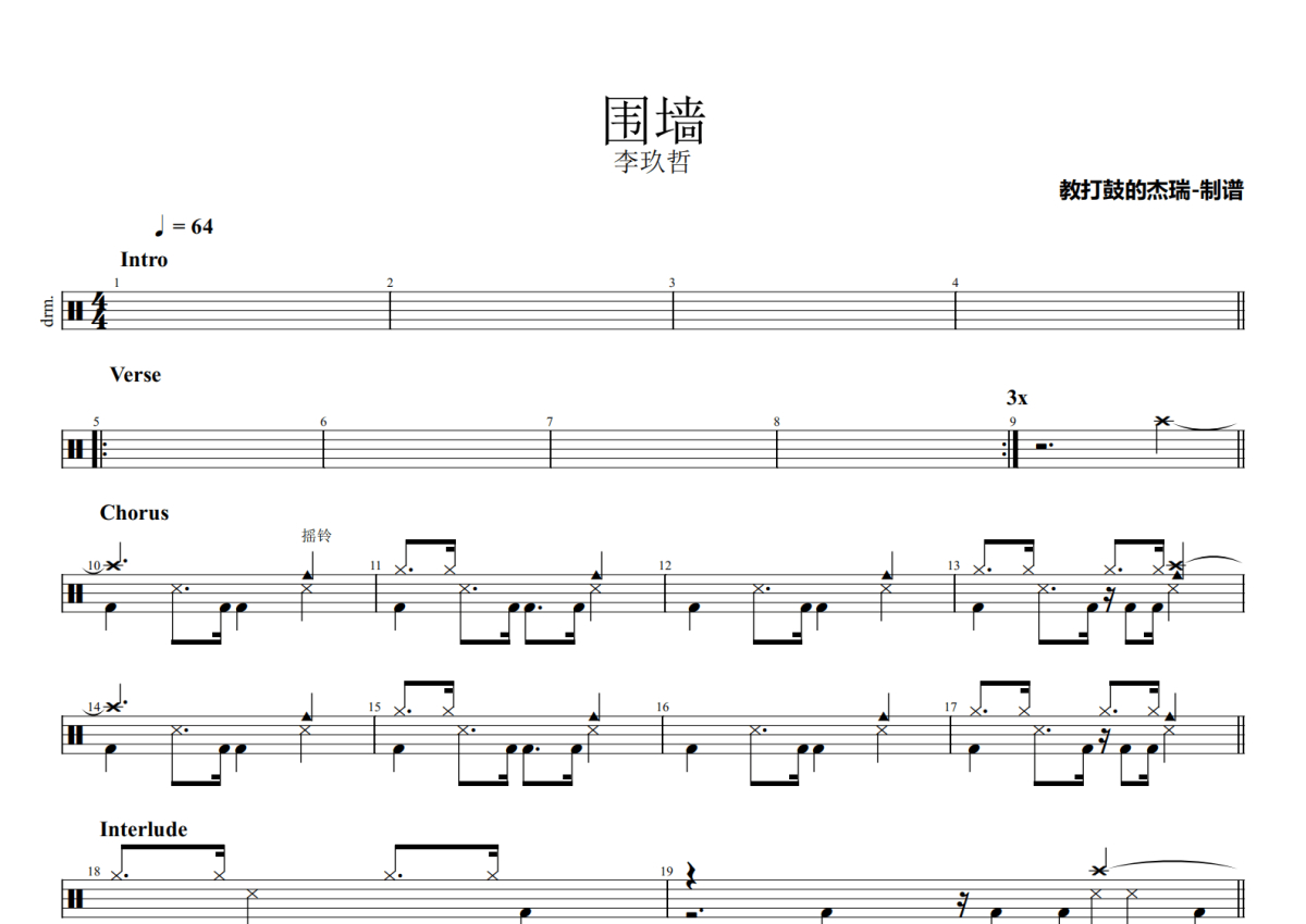 李玖哲《围墙》鼓谱 - 架子鼓谱