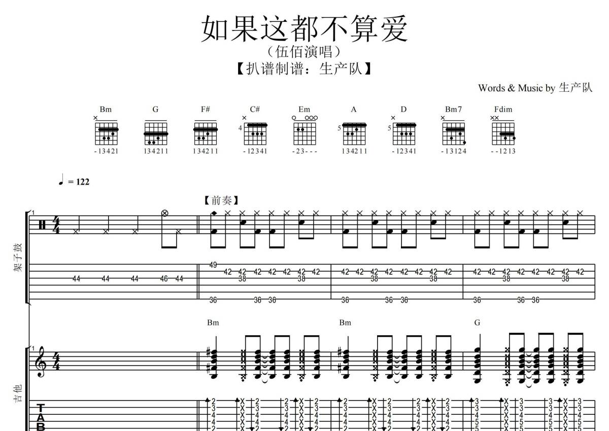 《如果这都不算爱》是伍佰演唱的一首歌曲,拍号为4/4拍,歌曲速度为每分钟122拍,这份乐队总谱共有一张高清图谱,图谱由 @生产队 编配上传伍佰-《如果这都不算爱》乐队总谱,根据原版D调指法编配,总谱包含:吉他,贝斯,鼓,键盘,主旋律总共5轨,完整版共31页,购买后请下载PDF文件,乐队总谱效果请听试听文件。