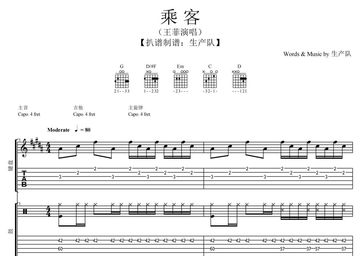 《乘客》是王菲演唱的一首歌曲,拍号为4/4拍,歌曲速度为每分钟80拍,这份乐队总谱共有一张高清图谱,图谱由 @生产队 编配上传王菲-《乘客》乐队总谱,根据原版采用G调指法编配,总谱包含:吉他,贝斯,钢琴,鼓,键盘,主旋律总共7轨,完整版共36页,购买后请下载PDF文件,乐队总谱效果请听试听文件。