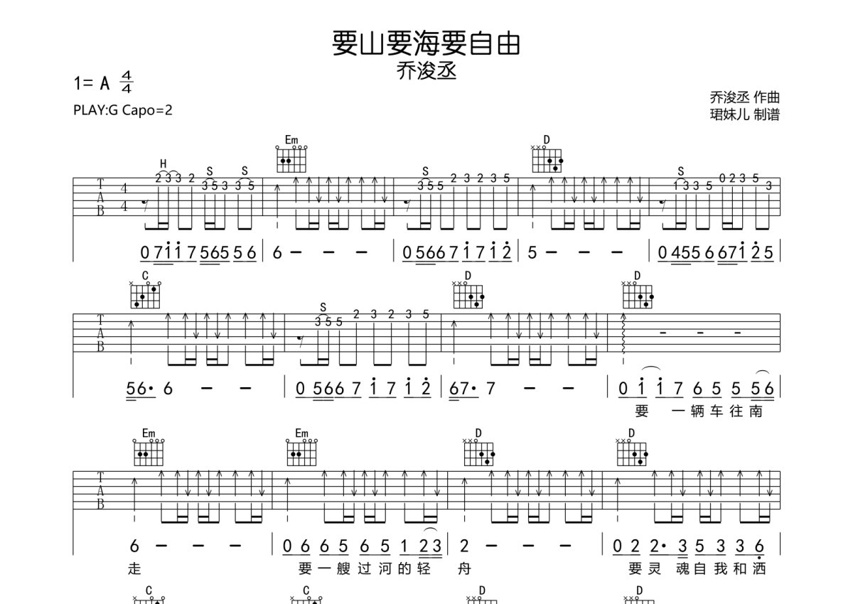 《要山要海要自由》是乔浚丞演唱的一首歌曲,拍号为4/4拍,歌曲速度为每分钟85拍,歌曲原调为A调,但由于原调指法比较难,为了方便弹奏,本吉他谱采用的是G调指法编配,变调夹2品弹奏即为原调,当然也可以根据自己的音域改变变调夹位置,或者通过改变和弦调性,以方便自己弹奏,这份吉他谱共有两张高清图谱,图谱由 @珺妹儿 编配上传,图谱使用六线谱编配,包含吉他和弦指法、简谱以及歌词部分,使用这份要山要海要自由吉他谱,可以让你更加方便地掌握这首歌曲的弹唱技巧,快来尝试吧。