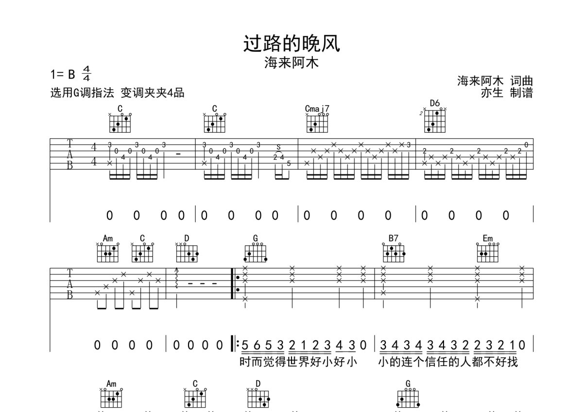 《过路的晚风》是海来阿木演唱的一首歌曲,拍号为4/4拍,歌曲速度为每分钟65拍,歌曲原调为B调,但由于原调指法比较难,为了方便弹奏,本吉他谱采用的是G调指法编配,变调夹4品弹奏即为原调,当然也可以根据自己的音域改变变调夹位置,或者通过改变和弦调性,以方便自己弹奏,这份吉他谱共有三张高清图谱,图谱由 @亦生 编配上传,图谱使用六线谱编配,包含吉他和弦指法、简谱以及歌词部分,使用这份过路的晚风吉他谱,可以让你更加方便地掌握这首歌曲的弹唱技巧,快来尝试吧。演奏难度为简单。