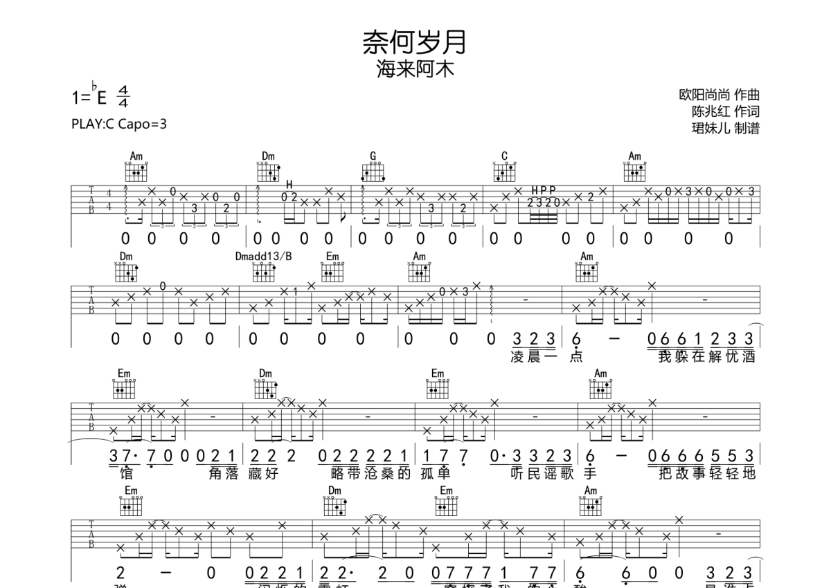 《奈何岁月》是海来阿木演唱的一首歌曲,拍号为4/4拍,歌曲速度为每分钟65拍,歌曲原调为Eb调,但由于原调指法比较难,为了方便弹奏,本吉他谱采用的是C调指法编配,变调夹3品弹奏即为原调,当然也可以根据自己的音域改变变调夹位置,或者通过改变和弦调性,以方便自己弹奏,这份吉他谱共有两张高清图谱,图谱由 @珺妹儿 编配上传,图谱使用六线谱编配,包含吉他和弦指法、简谱以及歌词部分,使用这份奈何岁月吉他谱,可以让你更加方便地掌握这首歌曲的弹唱技巧,快来尝试吧。